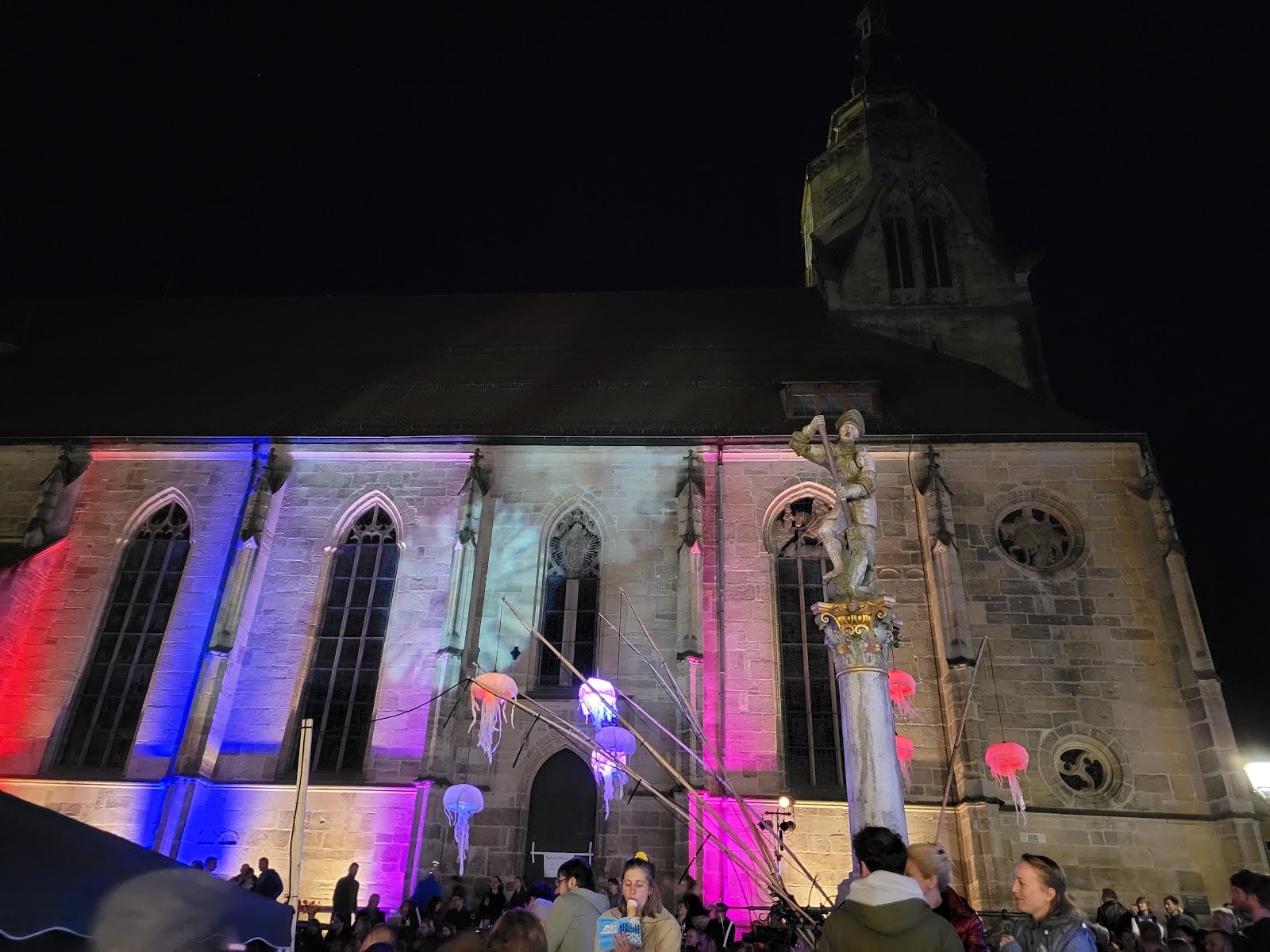 My first event at "Kultur Nacht" was getting to watch silk dancers hang under the Neckarbrücke to preform a choreographed routine only meters above the water, while boats filled with speakers played the Instrumentals of popular songs. After the end of the routine I watched a few of the free shows, concerts and monologues before meeting up with friends at Hohentübingen, the city's castle and currently a museum administered by the University of Tübingen. Inside, in the wing containing antique marble statues, a jazz quartet was preforming while a fashion show walked along the schultere filled environment. The atmosphere was unlike any show I have ever experienced, and once it was over another show began on the castle thoroughfare which adapted local fairytales with fire twirling. From here I went to the university's paleontology museum where a professor gave a tour of the exhibit, which ended in a sharp and bizarre dance which used dinosaur themed props. Shortly after, still in the museum, a band played American club jazz unter the fossilized remains of creatures that once swam in the prehistoric sea that is now Southern Germany. At this time it was midnight and I had been going to shows for 5 hours, and after watching my bus pull away as I approached the station I walked home and reflected on what I had just experienced. There were too many things going on to see even part of all of them, but everything I saw was well worth it.